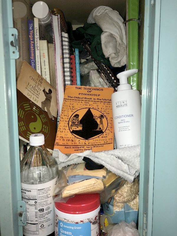 The locker was cramped and stacked with books of all sorts, a bottle of conditioner, an empty bottle of goodness knows what and a packet of oats?!