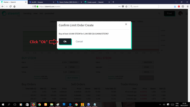 Step 4. After clicking "BUY STEEM" a pop-up notification will pop-up requiring you to confirm the order. Click "Ok" to proceed.