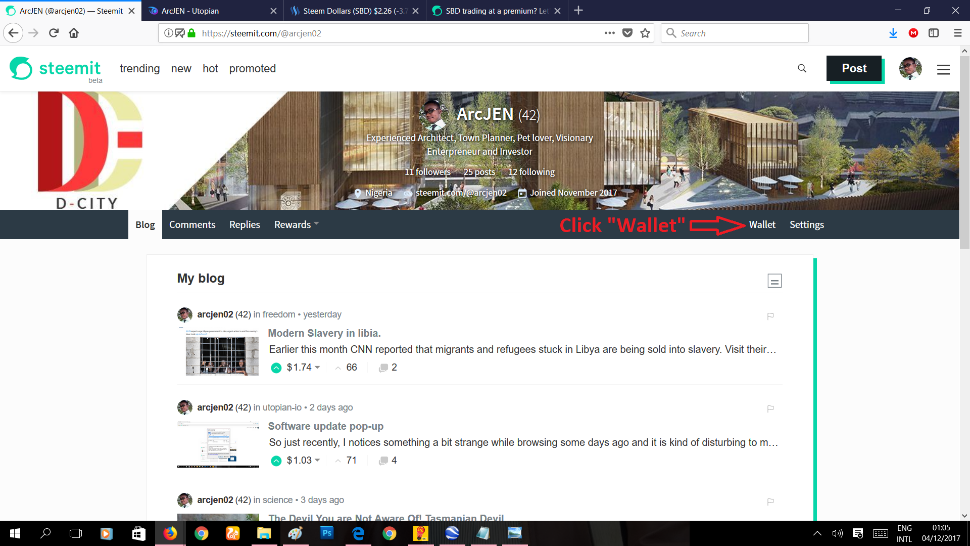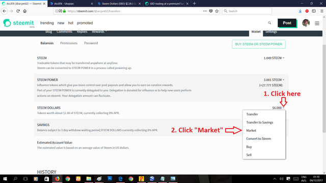 Step 2. Once on the wallet page, you then process to clicking the little button behind the SBD you have in your wallet then click "Market".