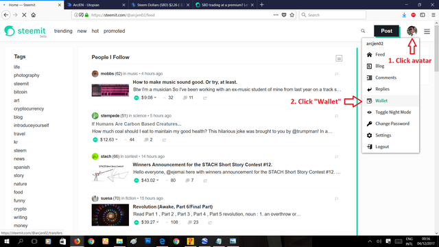 First step: After you have successfully logged into your steemit account navigate through to your wallet by clicking on the avatar then click on the "wallet" button in the drop down menu.