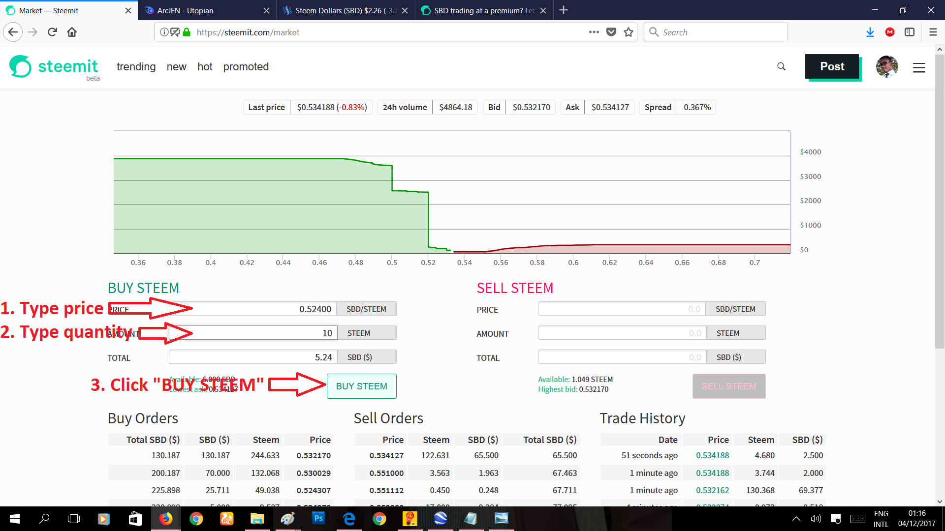 Step 3. Once on the market place you just proceed by imputing the price at which you are willing to buy Steem with SBD in the price box, the type the total amount of Steem you want to buy after which you click the "BUY STEEM" button to proceed.