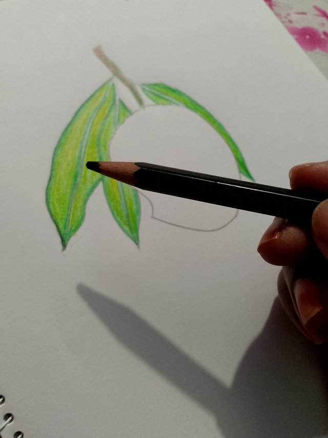 Now I will start coloring. First, I used dark green color on the outline of the leaves. Then I used a combination of light green and yellow colors in the middle part.