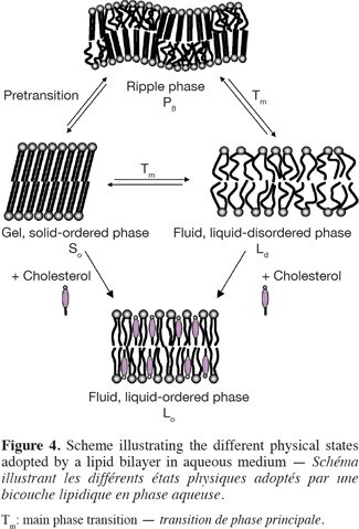 If you simplify what happens is this: Firstly as the temperature is less the lipids are more ordered and in gel state (crystalline ordered state). As the temperature increases and reaches a pre-transition temperature there are 2 states co-existing in the lipid, one ordered state, and another disordered fluid state. This is an intermediate Ripple state. As you keep on increasing temperature, the lipid becomes more disordered and fluid in the state especially when it reaches main transition temperature. Now there is one more intermediate state called liquid-ordered state which is attained with the help of addition of cholesterol. In the real cell membranes, its fluidity is mainly regulated by cholesterol. These molecules have the capacity to keep the lipid in fluid mode but keeps an order too in the system. In my opinion, cholesterol adds a negative feedback mechanism to the lipid bilayer for maintaining stable, but fluid state.