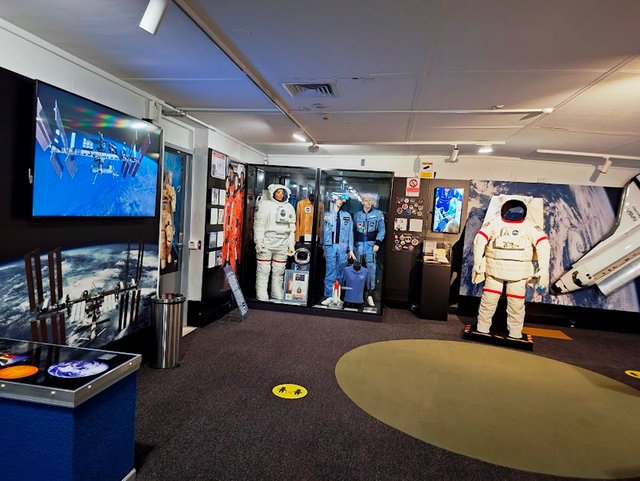 • Exhibits including spacesuits, models of spacecraft, and interactive displays.