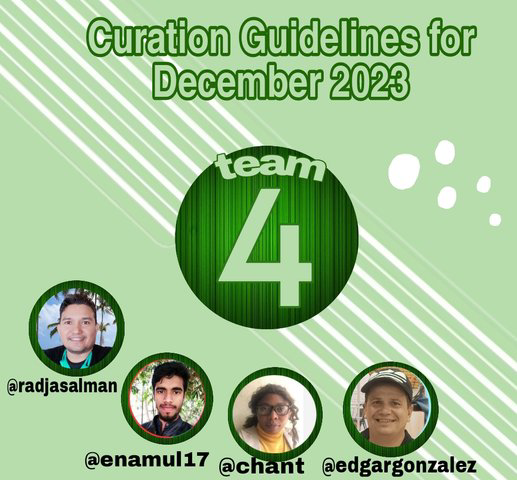 🌟For this new month of December I was selected to be part of curating team #4, so I have kept in touch with the new members that make it up, where we stay informed and organized to do a good job weekly within the platform Steemit and give maximum reach to the excellent work done within this platform!