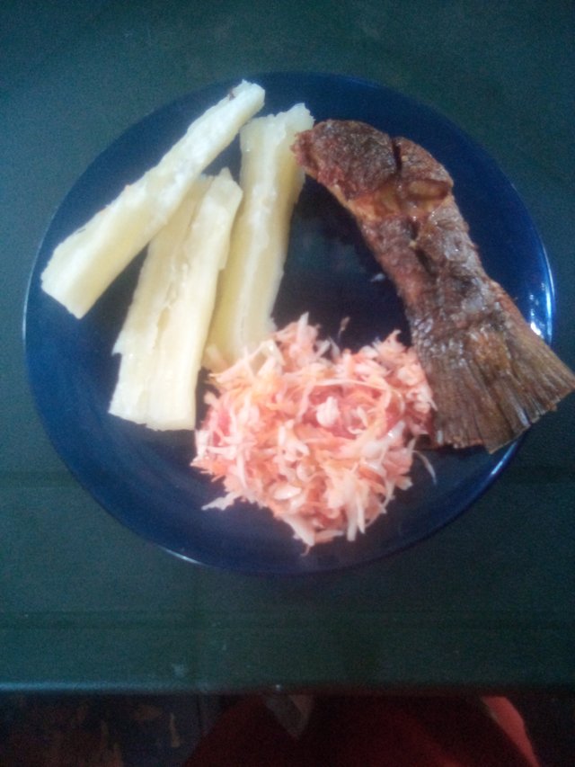 A la 1:00pm me tocó mi rico almuerzo yuca con pescado y ensaladita gracias a mi mamá y a mi abuelita, por este rica comida y agradecido con Dios por estos alimentos.