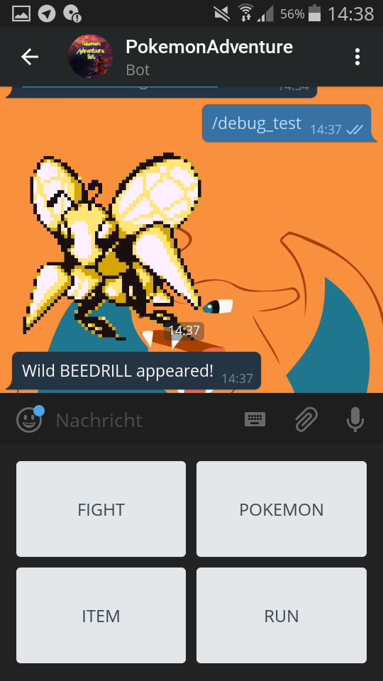 | There will also be a multiplayer mode that you can use in telegram groups! So you(!) can start your own little Pokemon League! | Zudem wird es einen Multiplayer Modus geben den man in Telegram Gruppen benutzen kann! So könnt ihr(!) eure eigene kleine Pokemon Liga starten! |