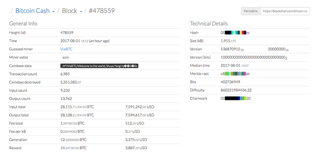 Bitcoin Cash矿工在8月1号UTC时间12:37,区块高度478558开始了分叉的第一步。6个小时之后,Viabtc挖出了第一个Bitcoin Cash块(#478559),接下来的第三个块也是由Viabtc矿池挖出的。