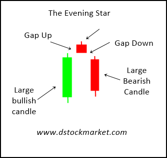 The formation of the evening star candlestick pattern is not that different from that of the morning star. The only difference is the positioning of the first and third candles.