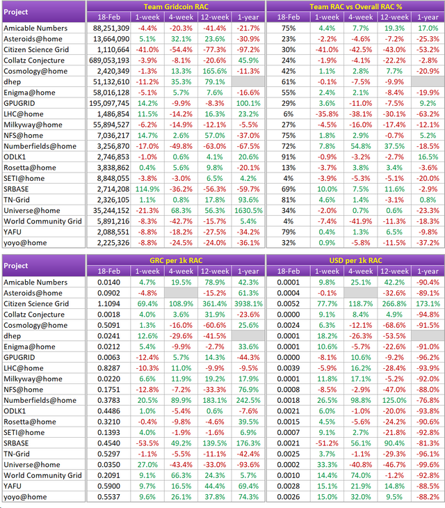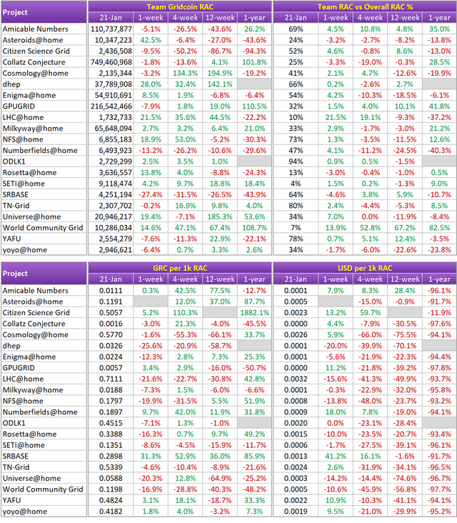On Mondays the information is gathered from BOINCStats and CoinMarketCap, after which I calculate the earnings in GRC and USD for systems with a RAC of 1000. Further details can be found in the definitions section below.