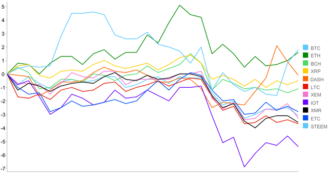 Graph: 24 hour percent change for top market cap coins (plus STEEM)