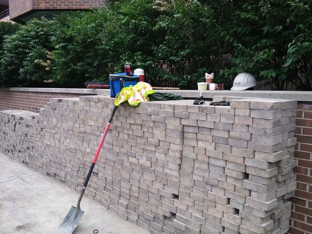 The bricks had to be removed from the ground by hand and stacked so that flower planters could be installed.