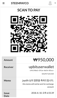 원화 가격을 설정해서 QR코드를 만들면 업비트SBD 시세에 맞춰서 전송되는 시스템이었습니다.