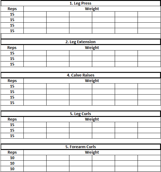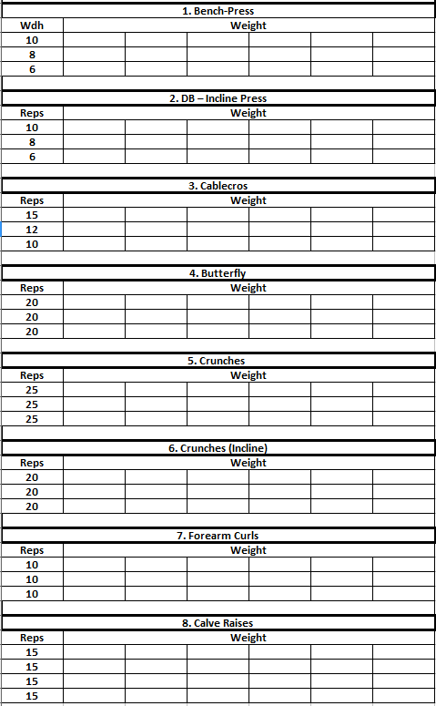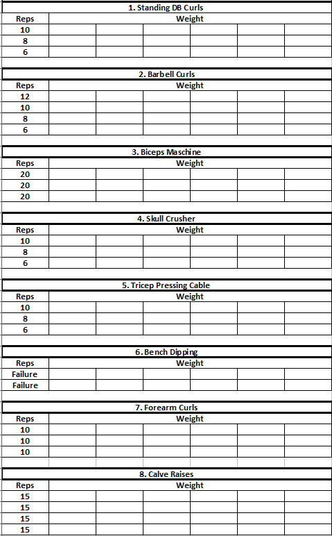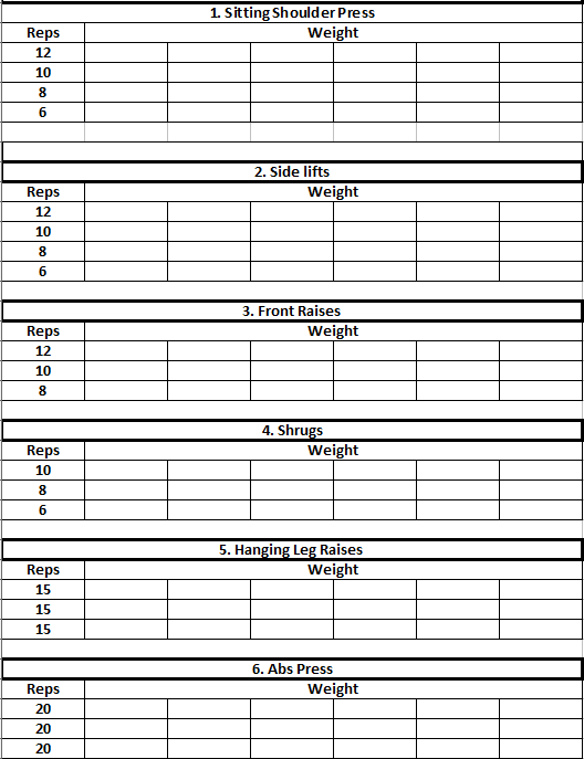 Warm up your shoulders before you start this workout. Shoulders are the most injured muscle. Start with 2 Sets of Light-Weight Sitting Shoulder Presses to prevent injury. No Calve or Forearm training on Thursday.