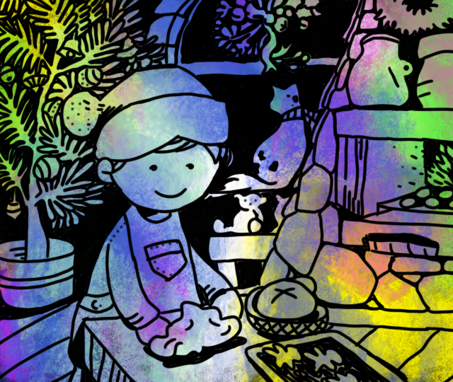 I drew a boy who is busy kneading the dough on the table top. Behind him is a holiday tree that he decorated with random baubles found from his old storage. Next to that is a window from which an evergreen branch hangs and underneath is a curious cat looking outside maybe watching the stars. Below the cat is a stuffed toy and a wood fired oven from which the boy does his baking. He has got two large jars of flour placed by the mantle of the oven. This is my entry for today's theme of the advent challenge 2019 which is busy baking. My boys although young are now capable of helping me in the kitchen. They request what kind of baked goods they like and I research on it and in a few days we will bake it together. Fun bonding moment with kids had never been so fun and happy. This Christmas I am thinking of baking some fruit cakes and maybe brownies with lots of nuts and caramel. It is that time of the year to try what I had learned on my personal baking journey. I know my family and friends would appreciate it knowing that I did everything from scratch and from my own research with the help of my two kitchen assistants who happens to be my kids.