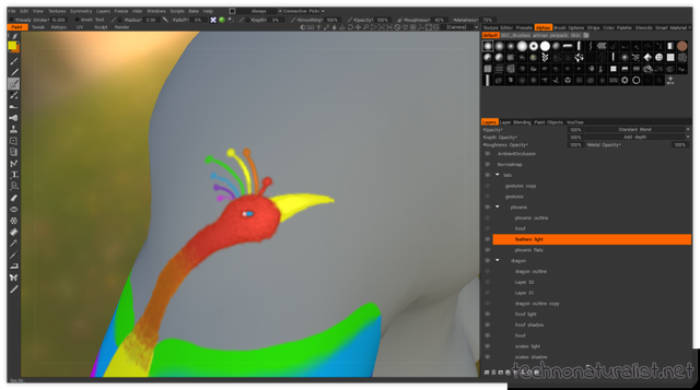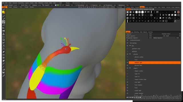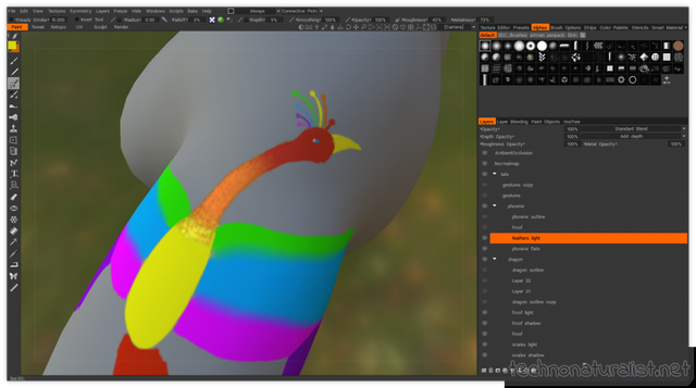 I had high hopes for the phoenix and started off exactly the same way as the dragon, playing around with brushes to get the job done faster. Exactly the same as the dragon, I couldn't find a brush to get me the look I wanted so by hand again. It progressed a lot faster than the dragon.