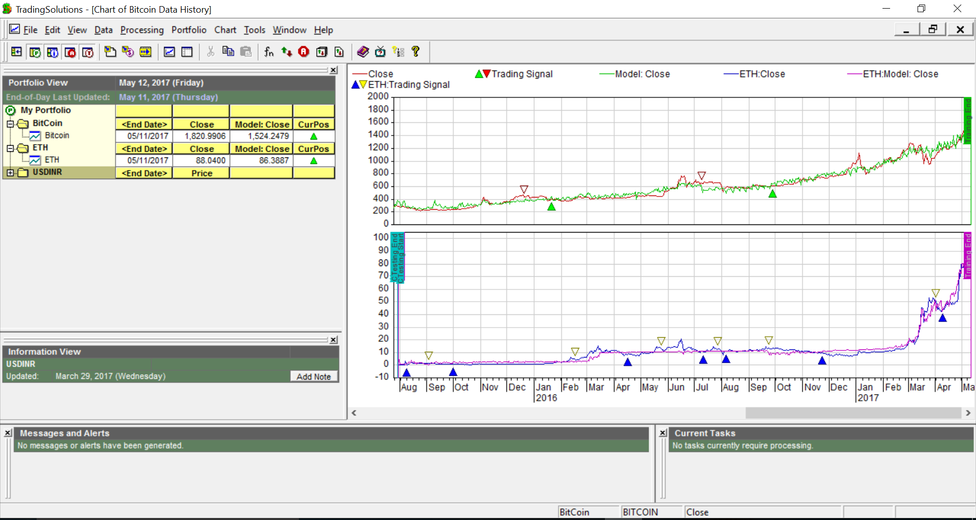Modeled price for both ETH and BTC is lower than actual price. It means that now these currencies are overpriced. However, as the trading signal for both still remain in Buy zone. So in summary remain Long but be watchful as reversal could be just around. Keep watching this space.