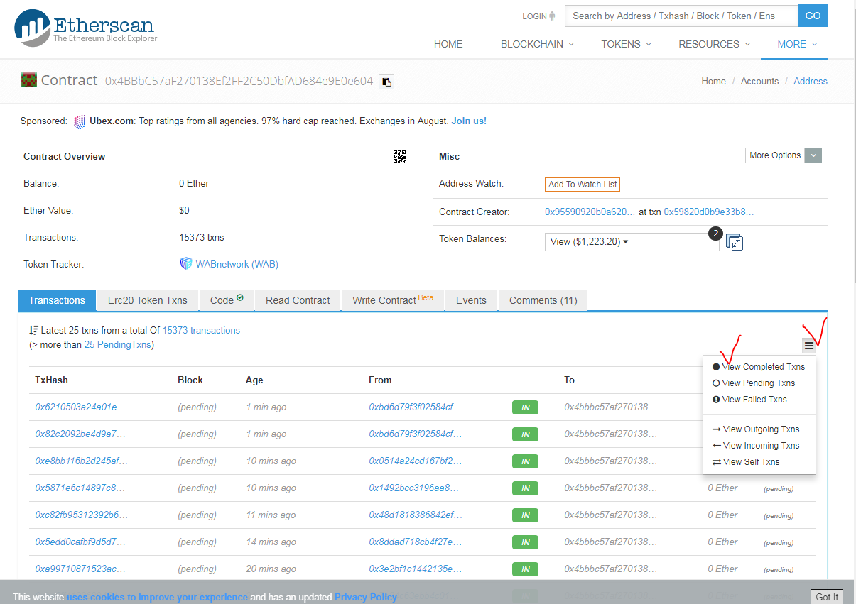 이더스켄 (https://etherscan.io) 에서는 특정 코인 즉 WAB 전송기록만도 볼 수 있습니다.