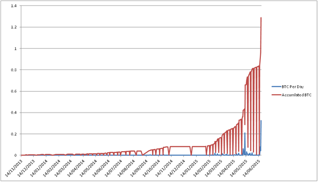 Chart of earnings over time. Blue is earnings per day. Red is total earnings over time.