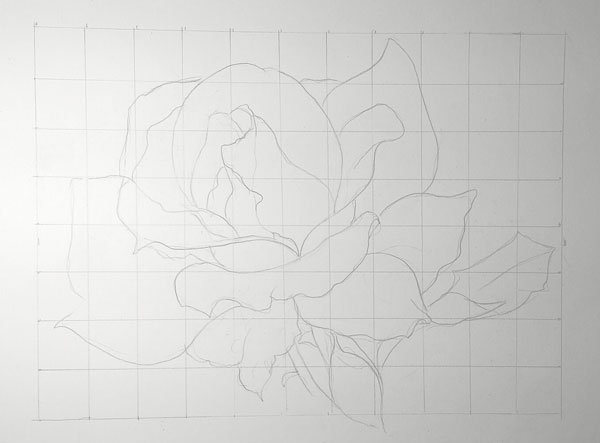 Step 1: This is a basic outline of a rose. I placed a one inch grid over it to help you create an accurate line drawing. This grid is 8×11. Draw a grid like this one very lightly on your paper with a mechanical pencil. (I use smooth bristol and 2B lead in my pencil.) Then, draw what you see within each square. When you’re sure you have a good drawing, carefully remove the grid from your paper with a kneaded eraser.