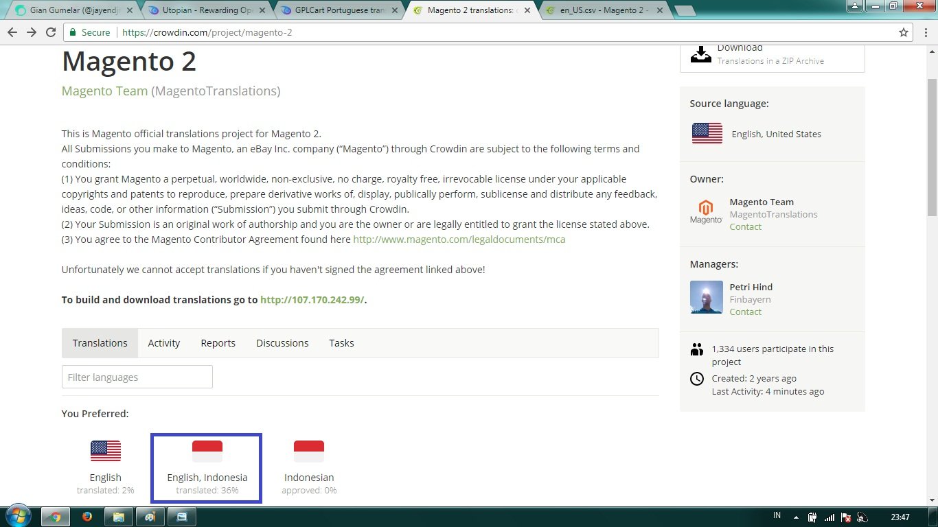I have contributed to the translation of the "English Translation, Indonesia Magento 2" project to be translated into Indonesian.