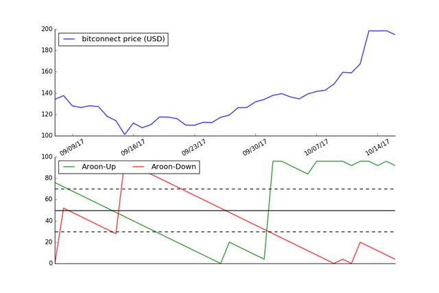 The graph below shows the Aroon Indicator using the price of Bitconnect over the last 40 days.