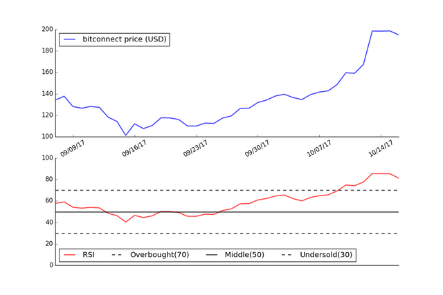 Since the RSI is currently above 70, this would indicate that Bitconnect is becoming overbought and that a price reversal to the downside is expected.