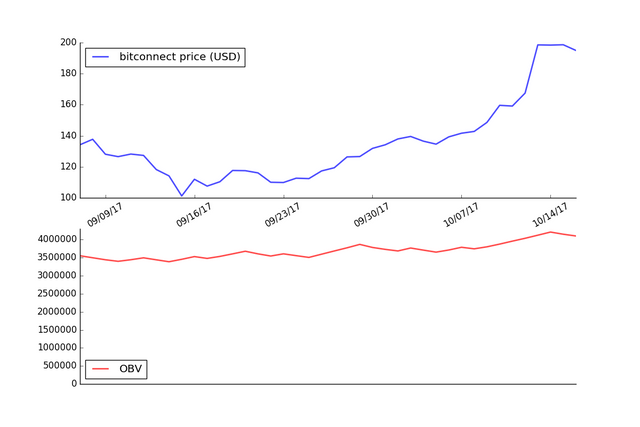 The graph below shows the OBV applied to the price of Bitconnect using daily price data for the last 40 days.