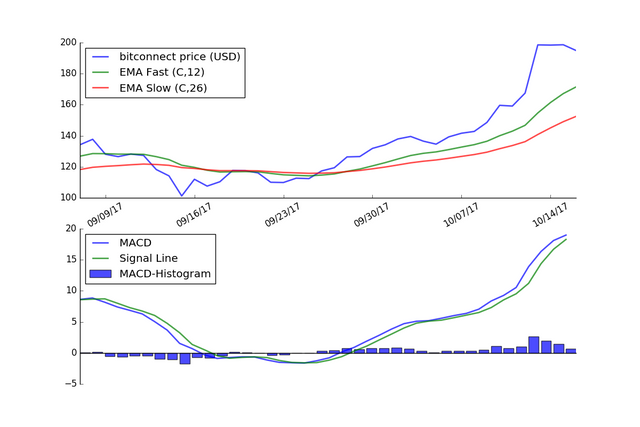 The graph below shows the MACD applied to the price of Bitconnect using daily price data for the last 40 days.