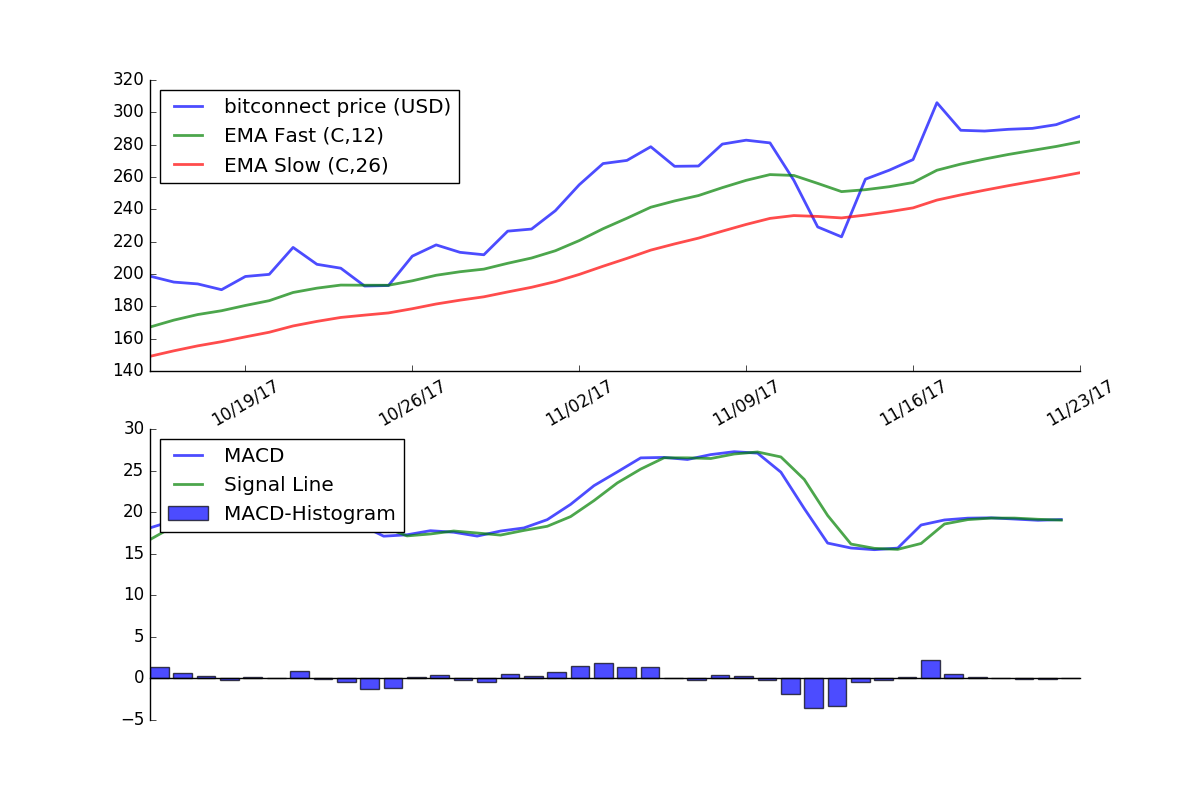 The graph below shows the MACD applied to the price of Bitconnect using daily price data for the last 40 days.