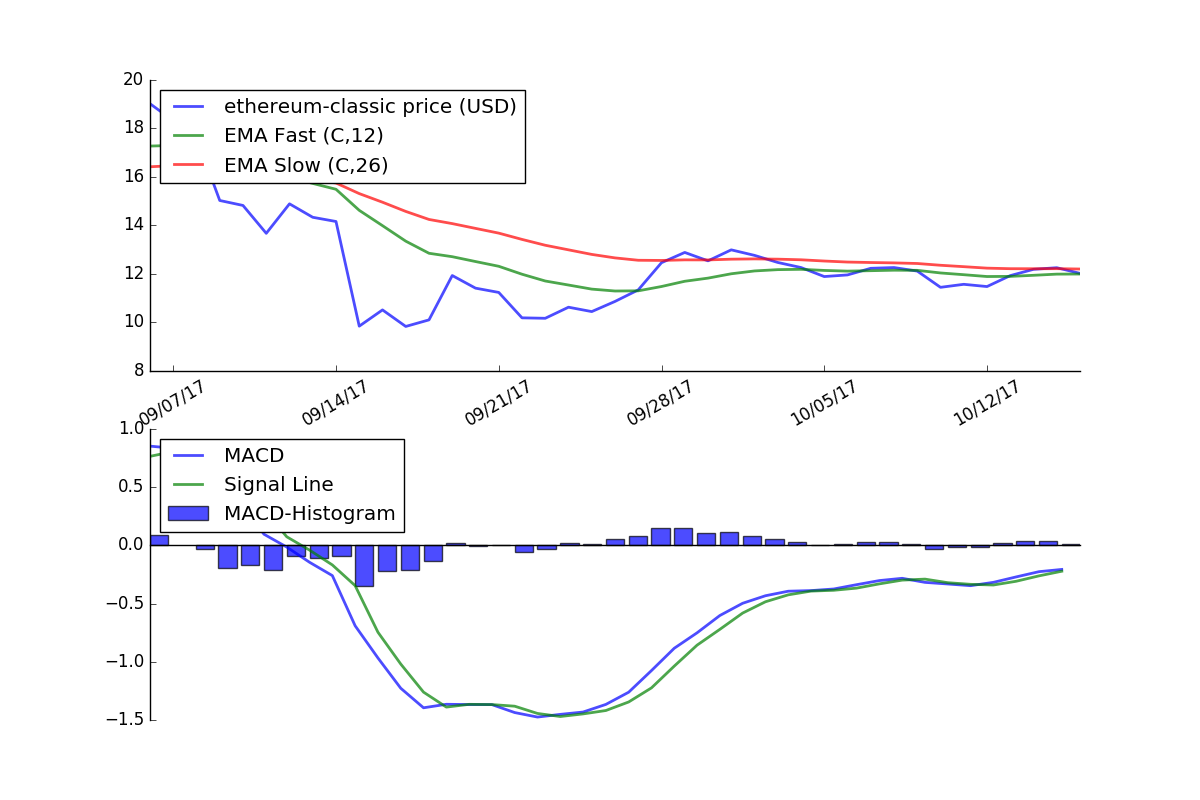 The graph below shows the MACD applied to the price of Ethereum-classic using daily price data for the last 40 days.