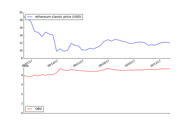 The graph below shows the OBV applied to the price of Ethereum-classic using daily price data for the last 40 days.