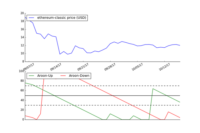 The graph below shows the Aroon Indicator using the price of Ethereum-classic over the last 40 days.