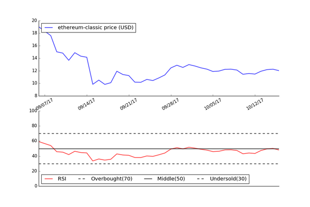 Since the RSI is currently between 30 and 70, this would indicate that Ethereum-classic is neither overbought or oversold and that no material price change is expected.