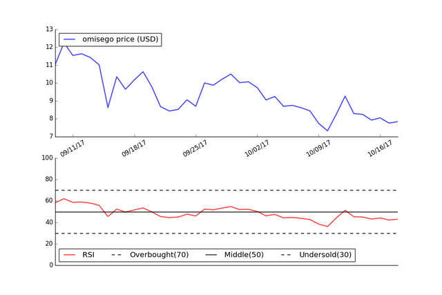 Since the RSI is currently between 30 and 70, this would indicate that Omisego is neither overbought or oversold and that no material price change is expected.