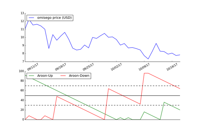 The graph below shows the Aroon Indicator using the price of Omisego over the last 40 days.