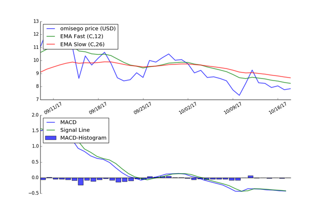 The graph below shows the MACD applied to the price of Omisego using daily price data for the last 40 days.