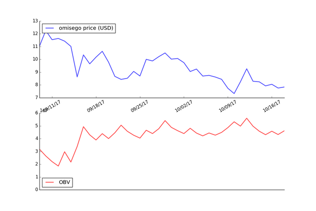 The graph below shows the OBV applied to the price of Omisego using daily price data for the last 40 days.