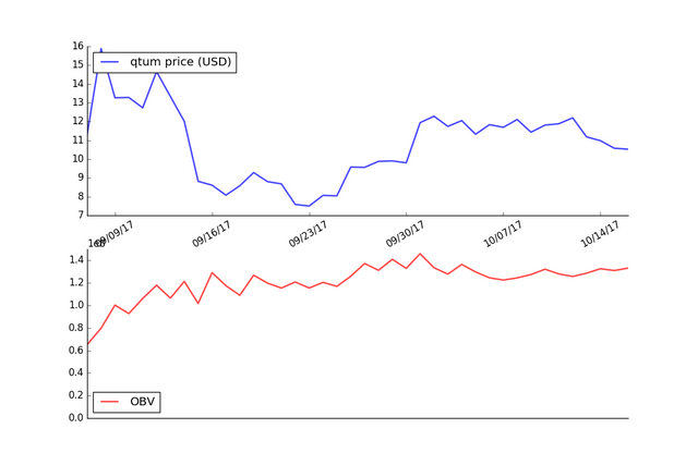The graph below shows the OBV applied to the price of Qtum using daily price data for the last 40 days.