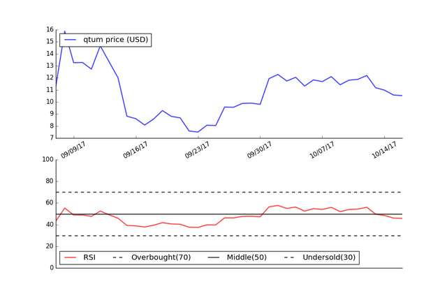 Since the RSI is currently between 30 and 70, this would indicate that Qtum is neither overbought or oversold and that no material price change is expected.