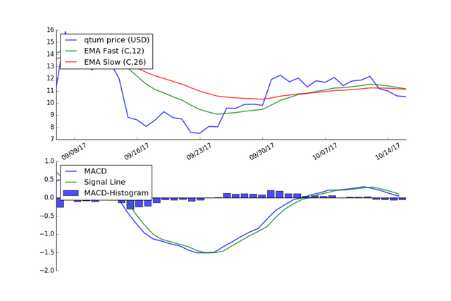 The graph below shows the MACD applied to the price of Qtum using daily price data for the last 40 days.