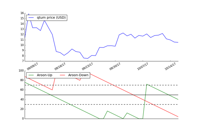 The graph below shows the Aroon Indicator using the price of Qtum over the last 40 days.