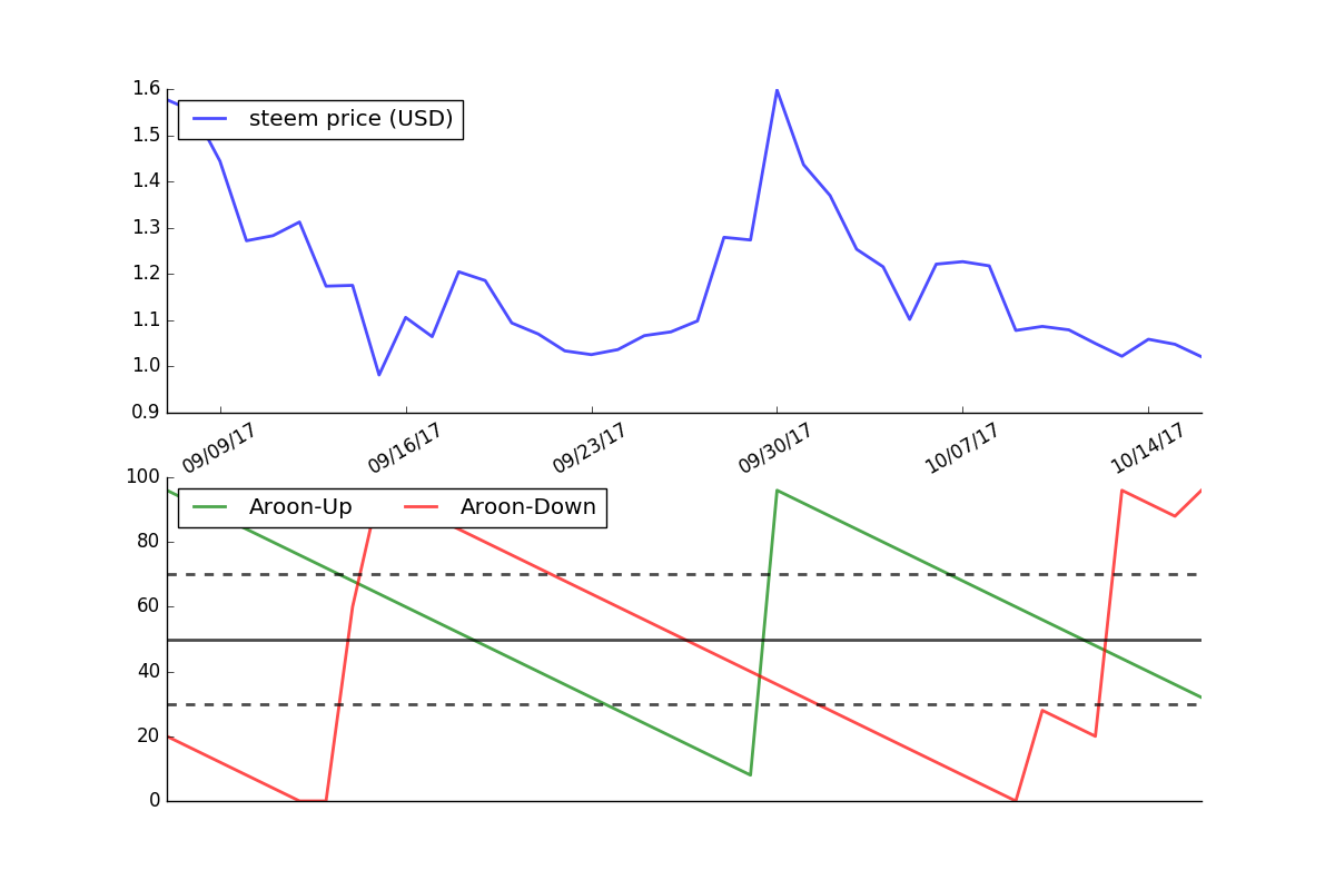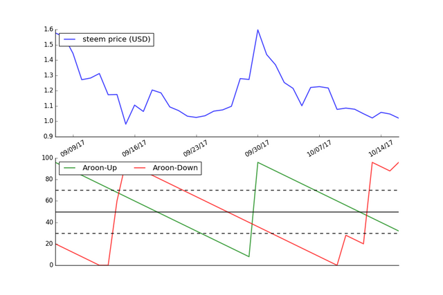 The graph below shows the Aroon Indicator using the price of Steem over the last 40 days.