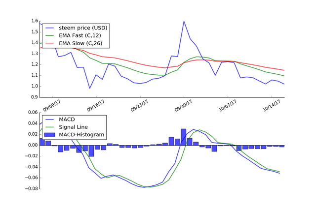 The graph below shows the MACD applied to the price of Steem using daily price data for the last 40 days.
