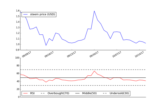 The graph below shows the RSI applied to the price of Steem based on daily price data for the last 40 days.