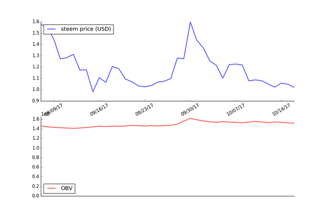 The graph below shows the OBV applied to the price of Steem using daily price data for the last 40 days.