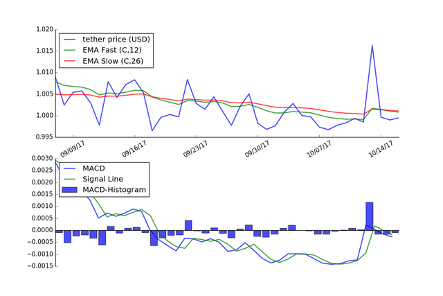 The graph below shows the MACD applied to the price of Tether using daily price data for the last 40 days.