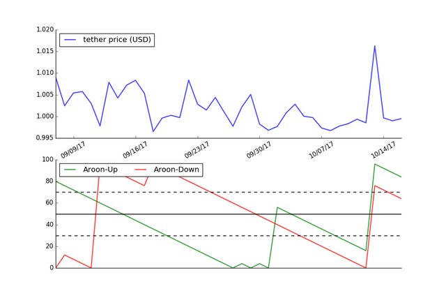 The graph below shows the Aroon Indicator using the price of Tether over the last 40 days.
