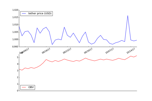 The graph below shows the OBV applied to the price of Tether using daily price data for the last 40 days.