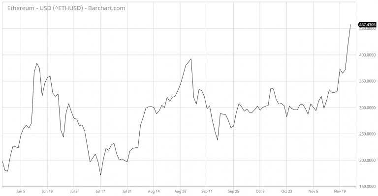 ETH/USD had one of its strongest weeks in recent memory as traders took price levels above a key technical threshold. The native ether token spiked more than 38% over the past five days, which is equivalent to $126. Prices touched a high of $466.85 before consolidating around $458. The gains five Ethereum a market cap of $44 billion, according to CoinMarketCap. Trade volumes over the past 24 hours exceeded $2.2 billion.